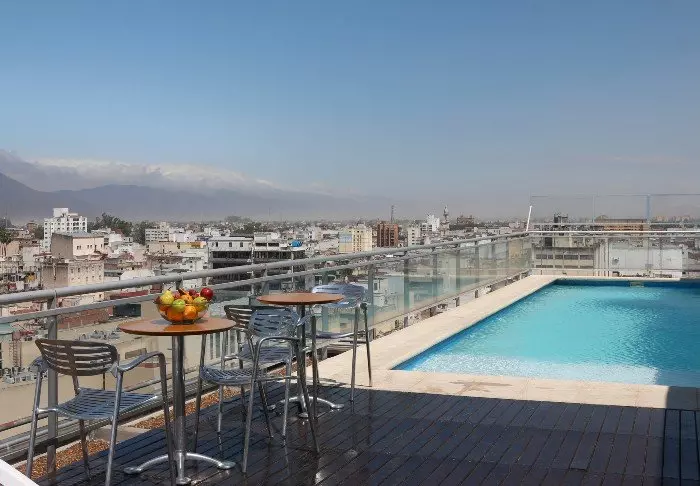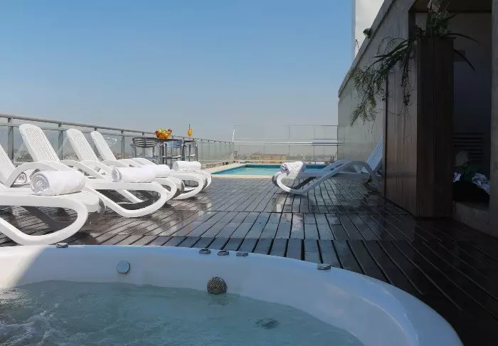På hotellets tak kan du ta deg en svømmetur i det lille, oppvarmede svømmebassenget og slappe av i jacuzzien med en drink i hånden og fantastisk utsikt over byen.