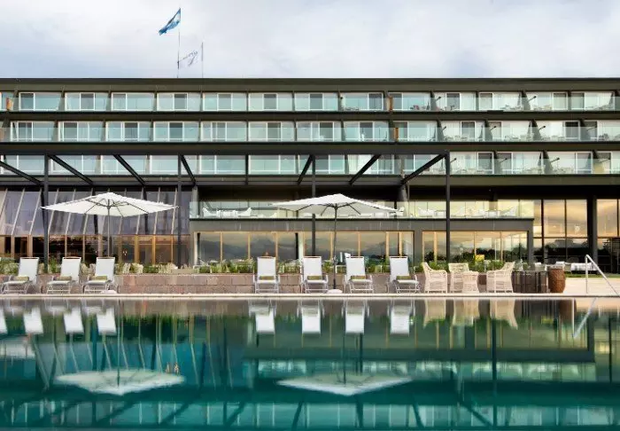 Hotellet ligger vakkert til ved Lago Argentino og er bygget i harmoni med Patagonias naturlige omgivelser.