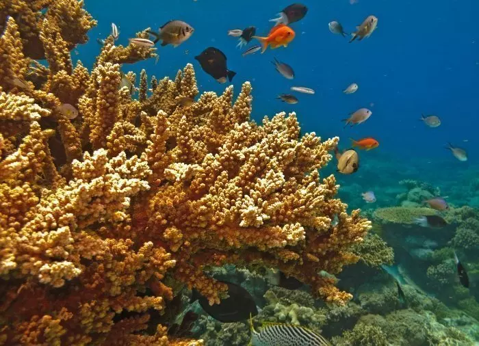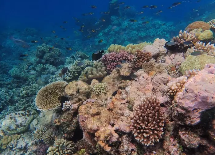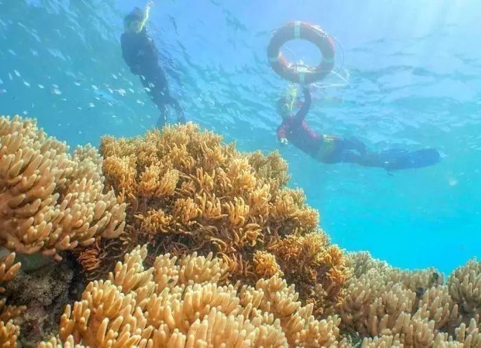 Du kan snorkle rett fra båten, eller du kan komme deg over til sandbanken og snorkle herfra. Hele dagen går det en liten båt i fast rute mellom katamaran og sandbanke, så du kan enkelt komme deg frem og tilbake.