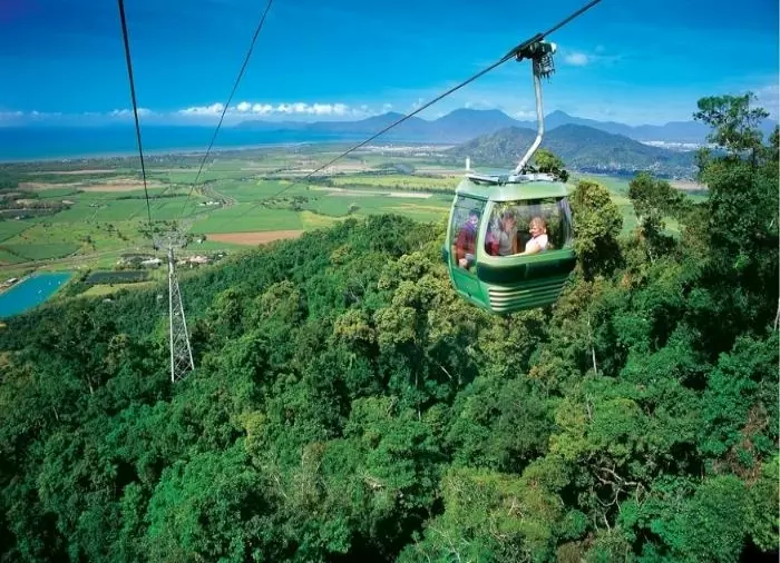Turen tilbake til Cairns foregår med Skyrail – en svevebane som langsomt glir over tretoppene tilbake til byen.