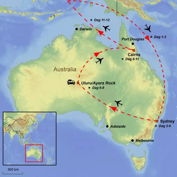 På denne reisen opplever du Australias absolutte største høydepunkter. Fra en av verdens vakrest beliggende byer, Sydney, reiser du til den øde ørkenen med Uluru som (bokstavelig talt) midtpunkt. Her ser du solen gå ned og stå opp over Uluru og drar på vandring ved Kata Tjuta.