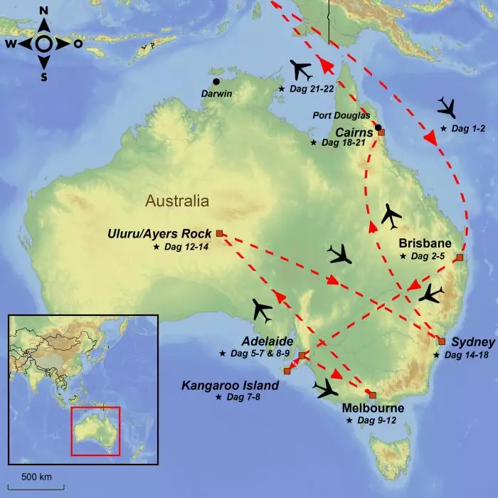 • Flyreise fra den valgte flyplassen til Brisbane og hjemreise fra Cairns med mellomlandinger underveis