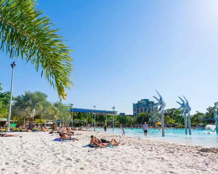 Cairns er en livlig kystby i det nordlige Queensland, og byen er nok mest kjent som porten til Great Barrier Reef, verdens største korallrev. Byen har dessuten masse aktiviteter, kafeer, restauranter og butikker. Det er ingen strand her, men for å kompensere for dette har man midt i byen bygget en stor kunstig lagune der du både kan sole deg og bade.