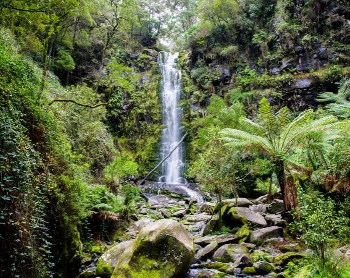 Vi anbefaler også et stopp ved den eventyrlige fossen Erskine Falls, som ligger omgitt av frodig regnskog rett utenfor byen Lorne.