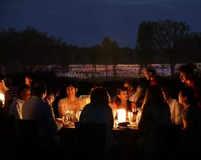Kvelden starter med et glass musserende vin i solnedgangen, mens lampene tennes, én etter én. På en måte er det alltid litt vemodig å se solen gå ned bak Uluru, men i dag venter det en belønning etter solnedgangen. Nyt en treretters middag, servert som buffé, før du tar en spasertur i Fields of Light. Vær oppmerksom på at middagen serveres ved store bord med ca. 10 gjester ved hvert bord.