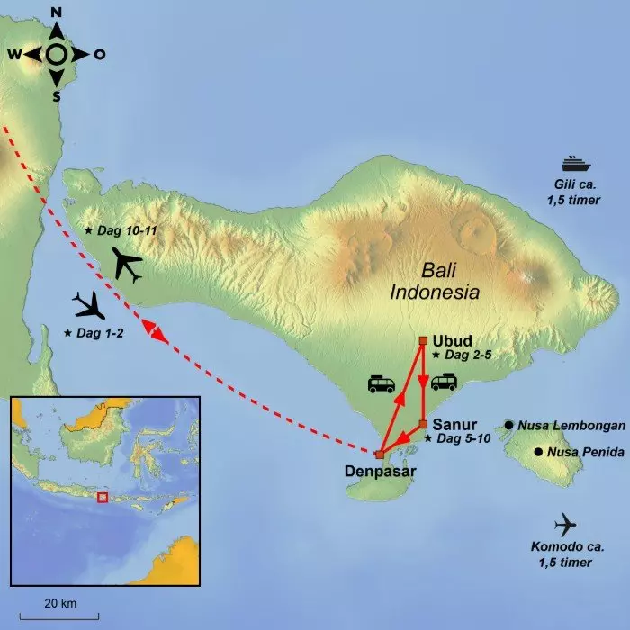 Reisen starter i den sjarmerende og fortryllende kunstnerbyen Ubud, som ligger vakkert til i Balis høyland omgitt av grønne rismarker, elver og hellige templer. Ubud er også Balis kulturelle hjerte hvor man legger sjelen i seremonielle opptog og dyrking av tradisjoner. Dagene er til fri disposisjon, og du kan velge og vrake mellom en rekke spennende tilkjøpsturer.