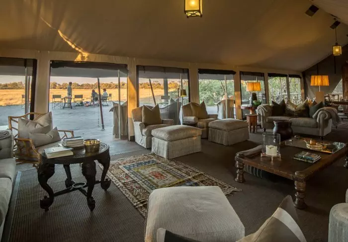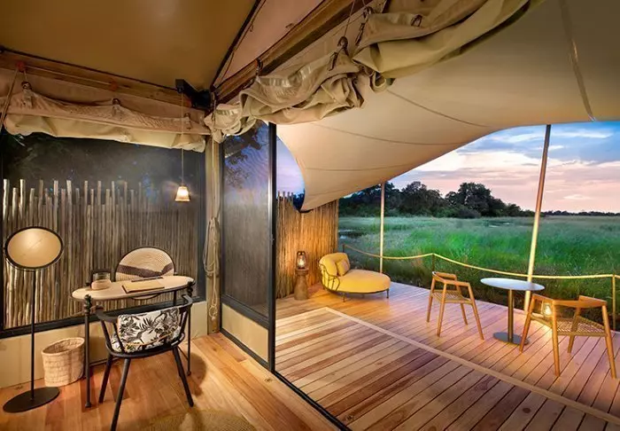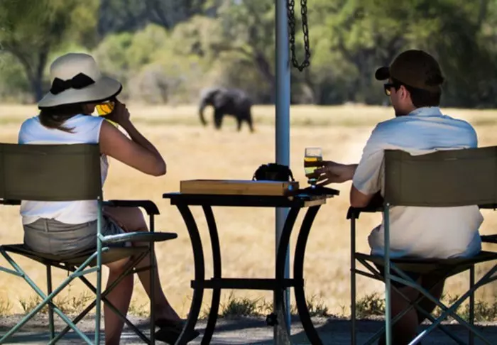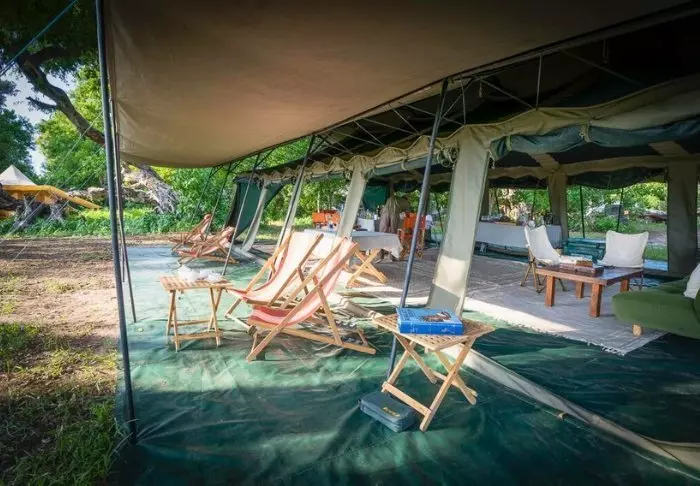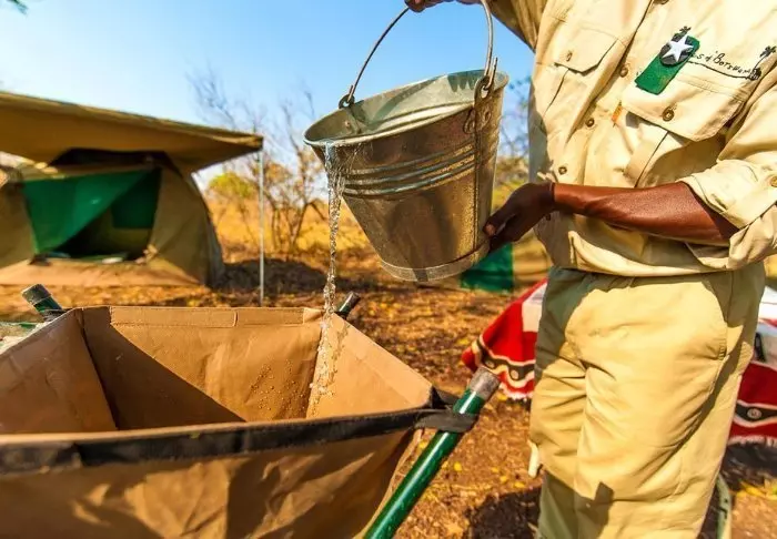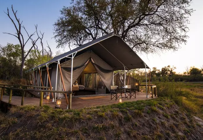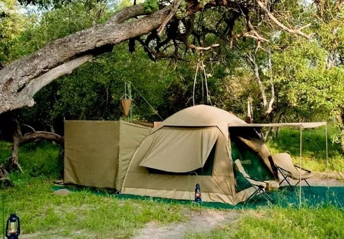 Utenfor teltet er det en liten skyggefull baldakin med stoler, slik at du kan nyte utsikten over naturen rundt deg. Du sover på en komfortabel sammenleggbar seng med en deilig og myk madrass, ekte dyner og puter og et lite nattbord. I direkte forlengelse av teltet har du ditt eget bushbaderom med dusj og toalett. Teltet har ikke strøm eller rennende vann, og du trekker ned i toalettet ved hjelp av jord og en liten spade – men det er et toalett! Flere ganger om dagen får du varmt vann, og du kan vaske deg i en liten servant som står i et stativ utenfor teltet. Hvis du har sett filmen «Mitt Afrika», vet du nøyaktig hvordan det fungerer. Om ettermiddagen blir vannet varmet opp og heist opp i en bøtte med et dusjhode under, slik at du kan ta en god og varm dusj. Det er primitivt, men komfortabelt, og viktigst av alt – det er overnatting på naturens egne vilkår, hvor du ikke etterlater spor mens du kommer nær deltaets dyreliv.