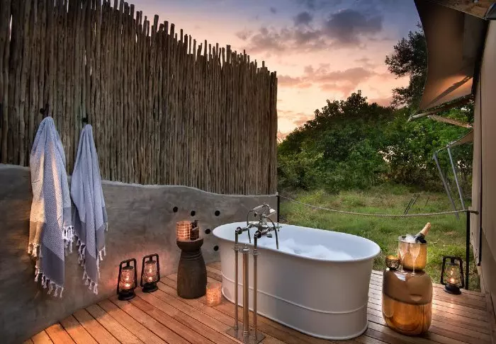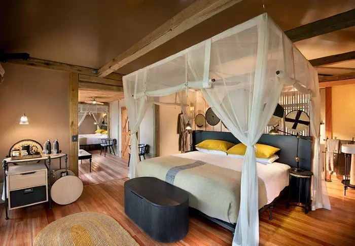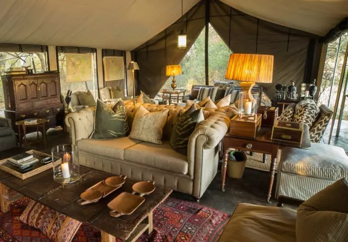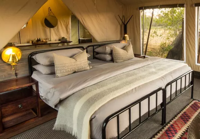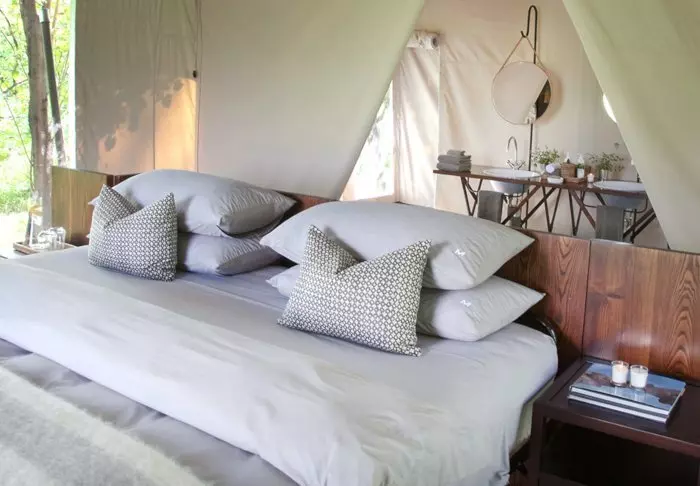 Det er ingen permanente bygninger i leiren, noe som er med på å gi deg følelsen av virkelig å være midt i naturen. Inne i teltet får du følelsen av luksus. Midt inne i teltet står en myk seng, og du har ditt eget bad med rennende vann og innendørs og utendørs dusj. Alle teltene er reist på plattformer, og fra de koselige verandaene er det flott utsikt over området.