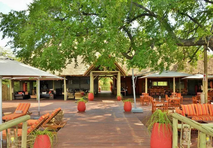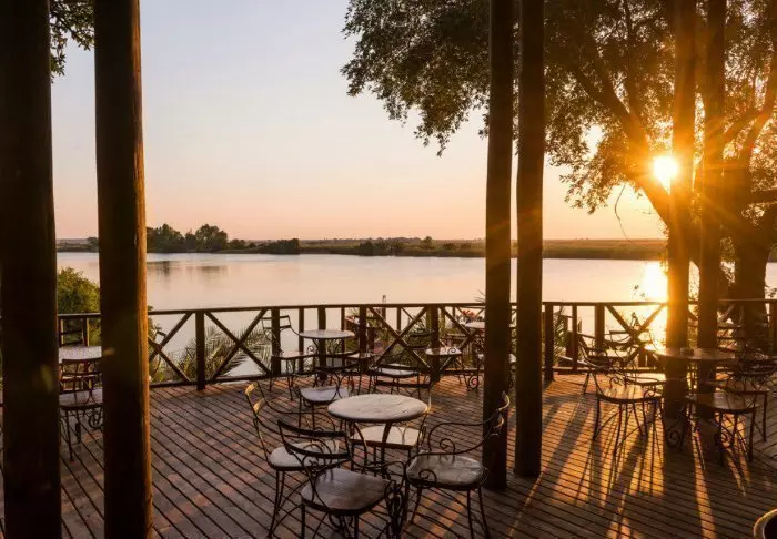 Lodgen har to restauranter, spa og to barer, og den ene av dem er det perfekte stedet å nyte en” sundowner” med utsikt til elven og solen som går ned over nasjonalparken.