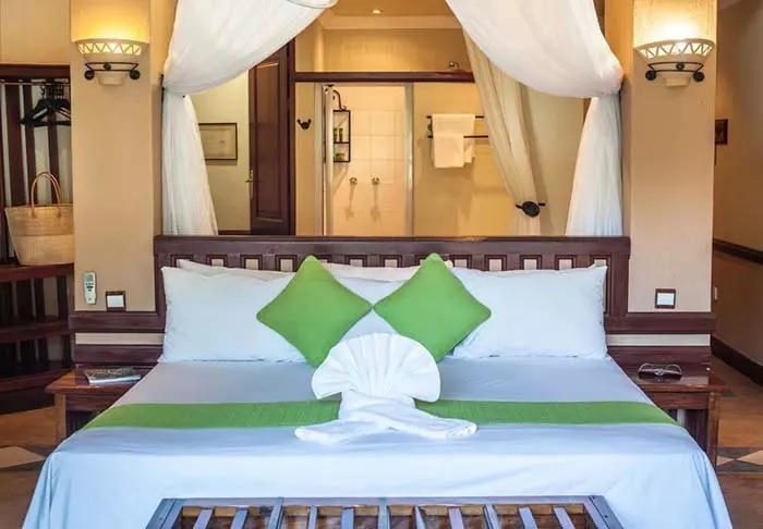 Rommene er store, moderne innredet og alle har myggnett rundt sengene, aircondition og mulighet for å lage te og kaffe.