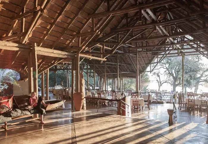 Frokosten spiser du med utsikt til elven – og etter safarien kan du nyte dagens siste solstråler i baren. Her er det også utsikt til elven. Det er stemningsfullt å sitte her mens solen går ned og høre dyrene grynte i den mørke elven.