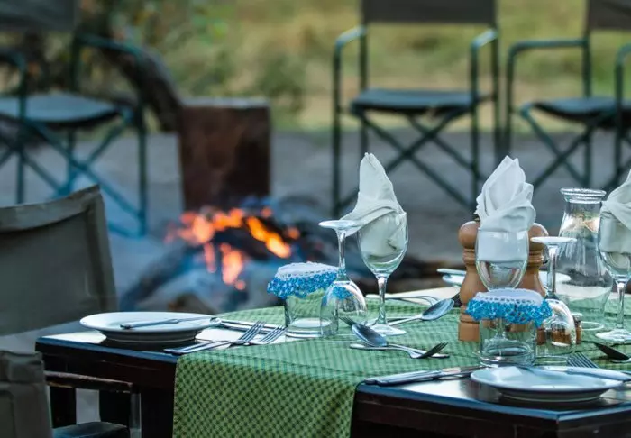 Måltidene nytes under stjernene, og maten er god! Ferskt tilberedt, smakfull og tilfredsstillende – faktisk får du stor appetitt når du er på safari. Selvfølgelig serveres både kald øl og vin til maten hvis du ønsker det, og det er te og kaffe på kannen hele dagen.