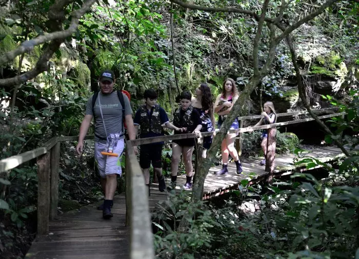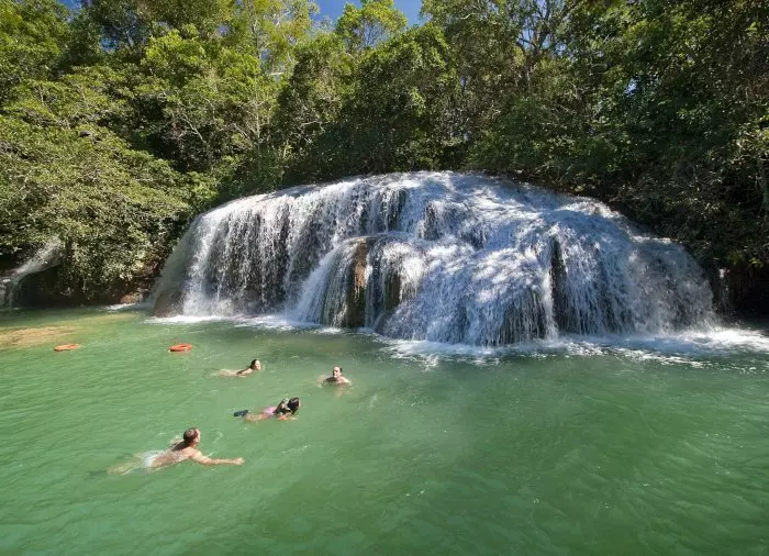 Deretter legger du ut på en guidet vandring gjennom den frodige skogen rundt elven Rio Mimoso, der du passerer 9 fosser med forskjellige former og størrelser. Underveis kan du svømme under fossene og i naturlige bassenger, utforske små huler og se ut over Serra da Bodoquena med fossene og fjellene i dalen rundt Mimoso-elven. Hvis du føler deg modig, kan du hoppe fra en 6 meter høy bro og ned i et naturlig vannhull. På noen strekninger kan du også bli med på en liten båttur og slappe av mens du nyter omgivelsene.