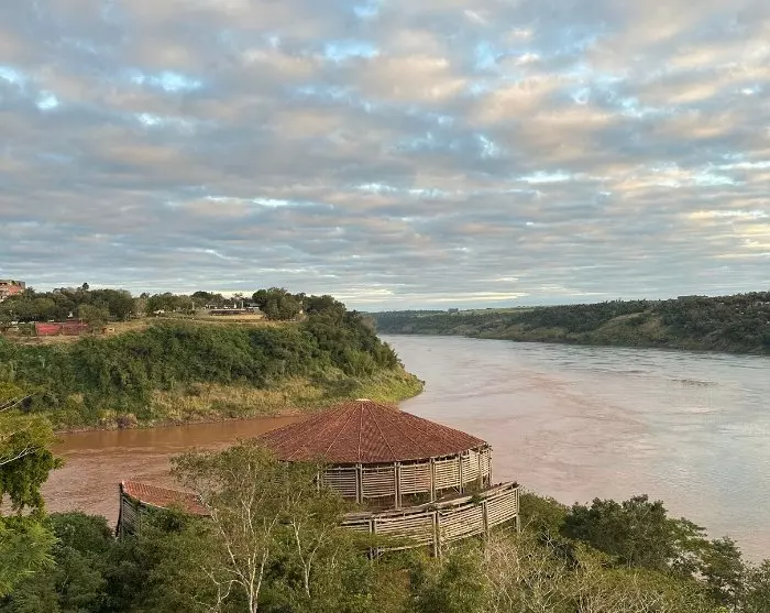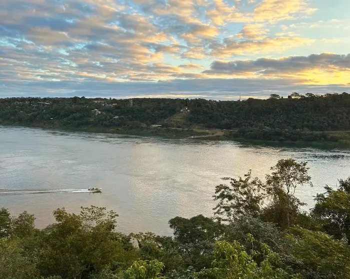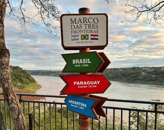 “Three Borders Landmark” eller “De tre grensers landemerke” er et fascinerende sted rett utenfor Foz do Iguaçu, ved sammenløpet av elvene Iguazú og Paraná, der grensen mellom Brasil, Argentina og Paraguay møtes.