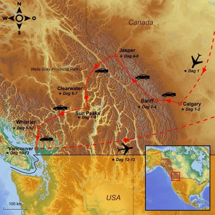 *Vær oppmerksom på at du i dag forlater Alberta til fordel for provinsen British Columbia. Du krysser også inn i en annen tidssone: British Columbia ligger én time bak Alberta.