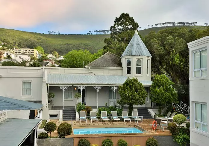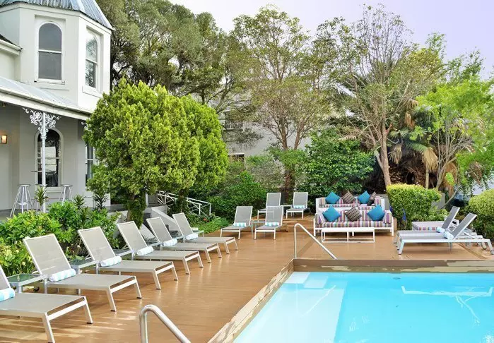 Fra basseng-området på det hyggelige 4-stjerners boutiquehotellet The Cape Milner har du en fantastisk utsikt mot toppen an Table Mountain. Så her vet du at du er i Cape Town!