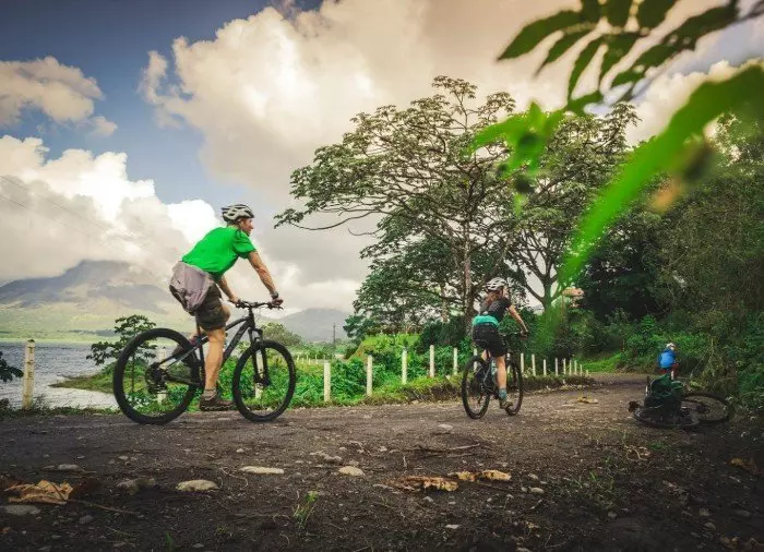 Du sykler ut til et utsiktspunkt over Arenal-sjøen, der det blir tid til en pause og en liten snack i vakre omgivelser før turen går tilbake til startstedet.
