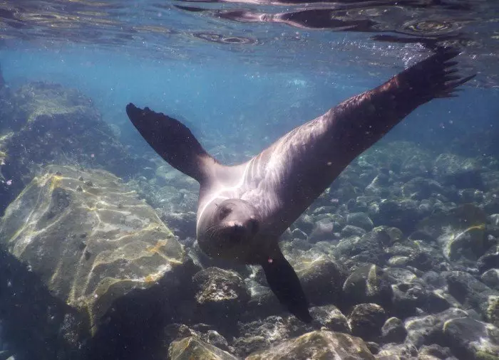 Deretter får du utlevert snorkel og maske og hopper i havet. Under havoverflaten skjuler det seg et ekte skattkammer av fargerike tropiske fisker, rokker, sjøløver og havskilpadder.