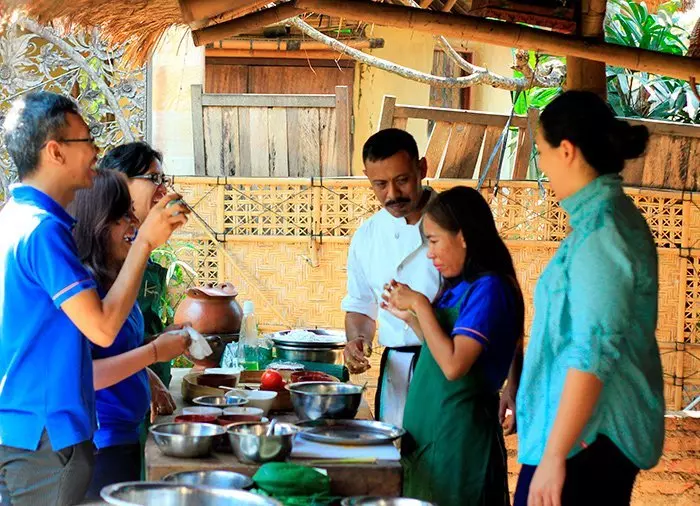 Turen starter om morgenen med et besøk på markedet, der du sammen med en kokk finner de råvarene du skal brukes til dagens matlaging. Tilbake på kokkeskolen lærer du først litt om de klassiske balinesiske tilberedningsmetodene før du selv får prøve å lage flere velsmakende retter.