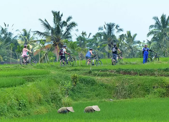 Ready, set, go – og så bærer det avgårde. Du sykler forbi lysegrønne rismarker og gjennom små, hyggelige landsbyer der du får oppleve balinesernes dagligliv på nært hold. Du stopper flere ganger underveis for å nyte og ta bilder av det usedvanlig flotte landskapet og vakre rismarker, hvor du ser de lokale bøndene pløye, så eller høste, avhengig av årstiden.