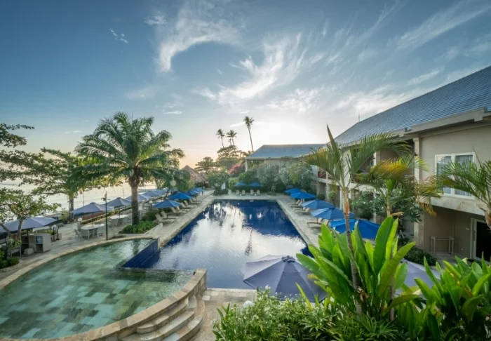 Puri Santrian er et deilig, 4-stjerners resort som ligger like ved en 200 meter lang privat strand i Sanur. Vannet er rolig, og stranden er derfor utrolig barnevennlig.