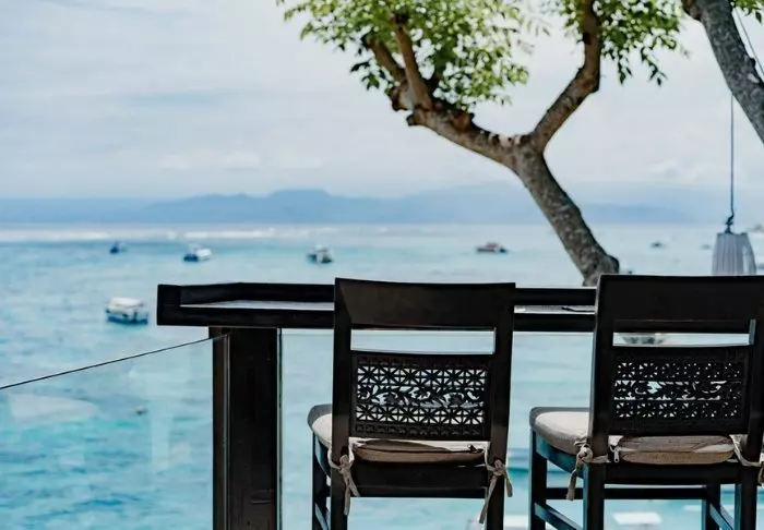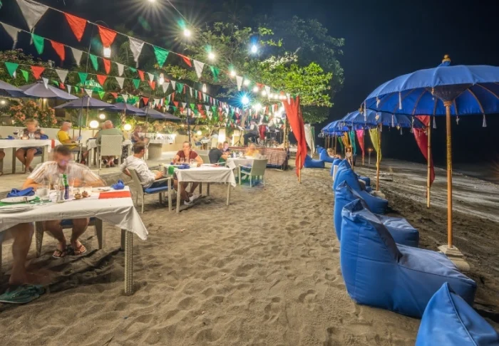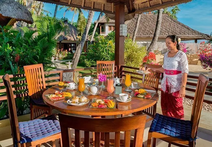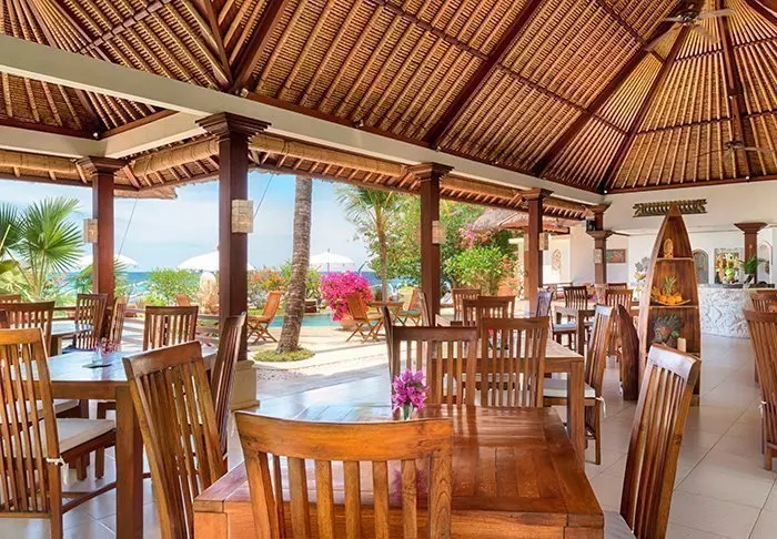 På restauranten står et team fra den lokale landsbyen klar til å servere balinesiske og indonesiske retter laget av lokale råvarer og fersk fisk som fanges av lokale fiskere. Her er det en deilig bris fra havet og vakker utsikt til stranden.