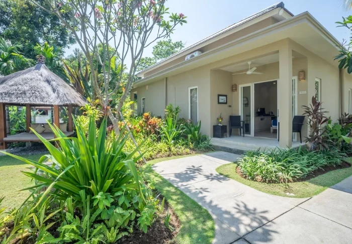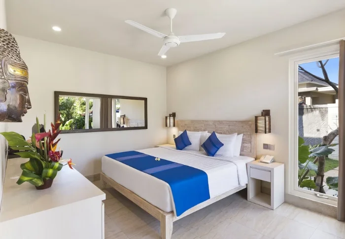 Som standard bor du i en av de sjarmerende hagehyttene omgitt av palmetrær og tropiske planter. Rommene er store og innredet i lyse farger med flotte treelementer. Alle rom har moderne bekvemmeligheter som aircondition, Wi-Fi, minibar, safe, kaffe- og tefasiliteter og flatskjerm-TV. Rommene har også privat terrasse/balkong der du kan nyte morgenkaffen i ro og mak. De delvis utendørs badene har dusj og hårføner, og naturligvis er det også toalettartikler. Alt er laget for å skape en avslappende base.