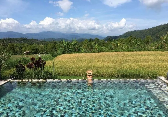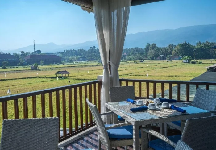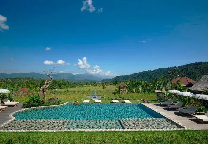 Hotellet har en deilig solterrasse med liggestoler, svømmebasseng og et mindre barnebasseng. Her kan du slappe av og lade batteriene mens du beundrer utsikten over rismarkene, de høye palmene og tropiske trær og planter.
