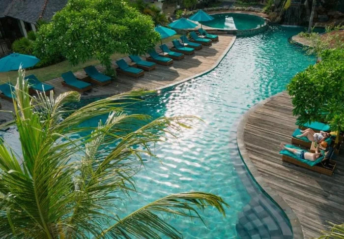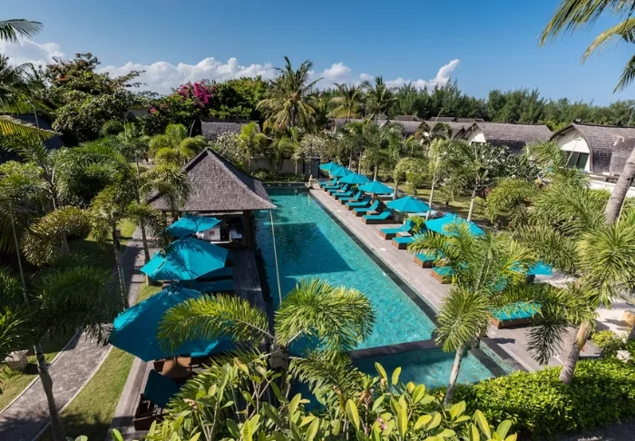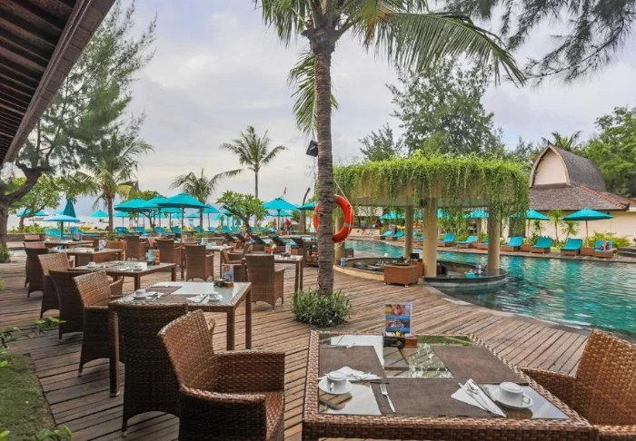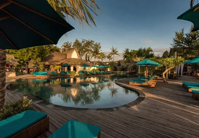 I hagen ligger hotellets to flotte bassengområder. Det ene bassenget har tilhørende barnebasseng og utsikt over stranden og naboøya Lombok med fjellet Rinjani. Det andre bassenget er for voksne og ligger mer tilbaketrukket, midt i den tropiske hagen med palmer og frangipani. Begge bassengområdene har parasoller, liggestoler og “swim-up bar”, der du kan bestille kalde drinker, ferskpresset juice og kokosvann servert i en kokosnøtt – et absolutt must når du er på Gili!