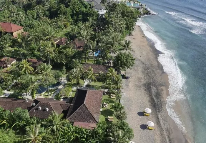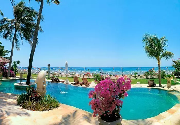 Resorten har en enestående beliggenhet, rett ved Sanurs finkornede sandstrand som frister til soling og bading. Hvis du er tidlig oppe, kan du se solen stå opp over de tradisjonelle fiskebåtene ute i horisonten.