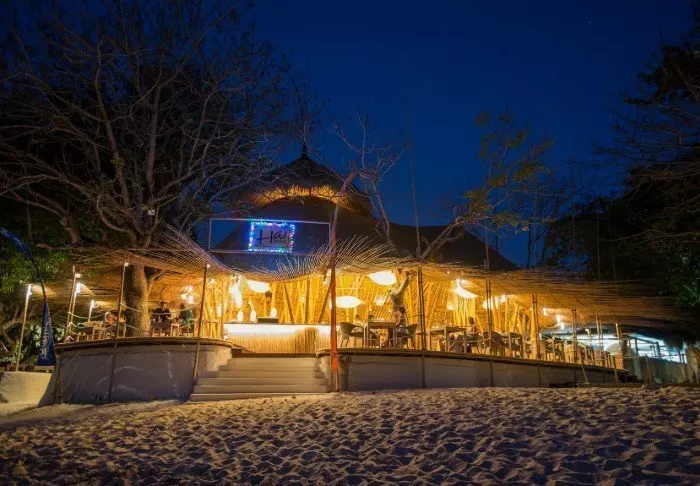Hver kveld (hvis været tillater det) forvandles stranden til utendørskino, og der kan du spise popkorn til filmen og nyte andre forfriskninger fra The Blue Beach.