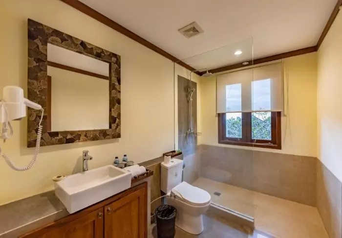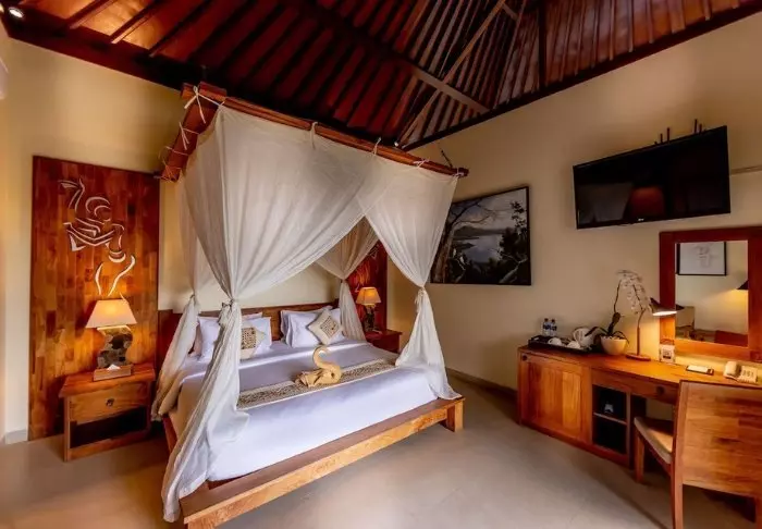 Rommene er 50 kvm store og lekkert innredet i moderne balinesisk stil som glir perfekt inn i de naturskjønne omgivelsene. Alle rommene har WI-FI, aircondition, takvifte, te- og kaffefasiliteter, minibar, gratis flaskevann, verdiboks, tv og telefon. Badet er utstyrt med badekåpe og tøfler, hårføner og toalettartikler. Etter forhåpentligvis å ha hatt en god natts søvn, kan du sette deg ut på din private terrasse, som har utsikt til de grønne omgivelsene. Du kan nyte en kopp dampende te eller kaffe mens du lytter til de mange lydene fra jungelen.