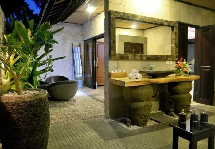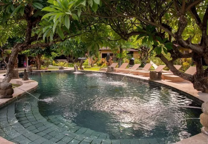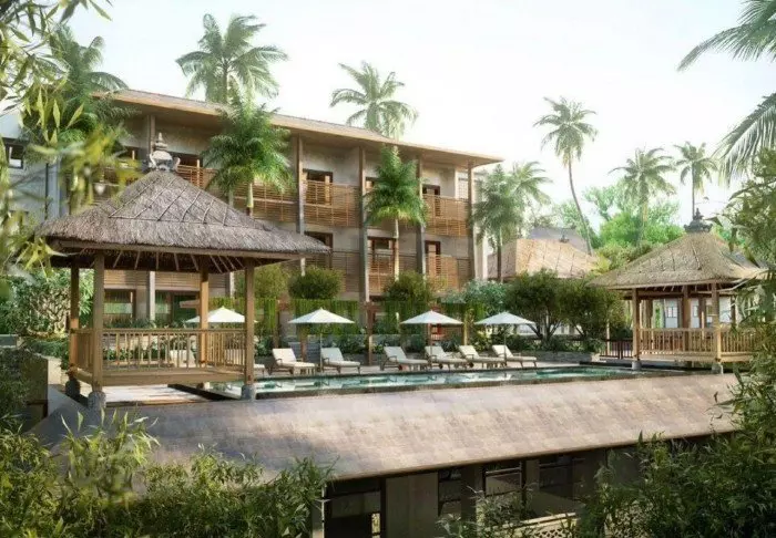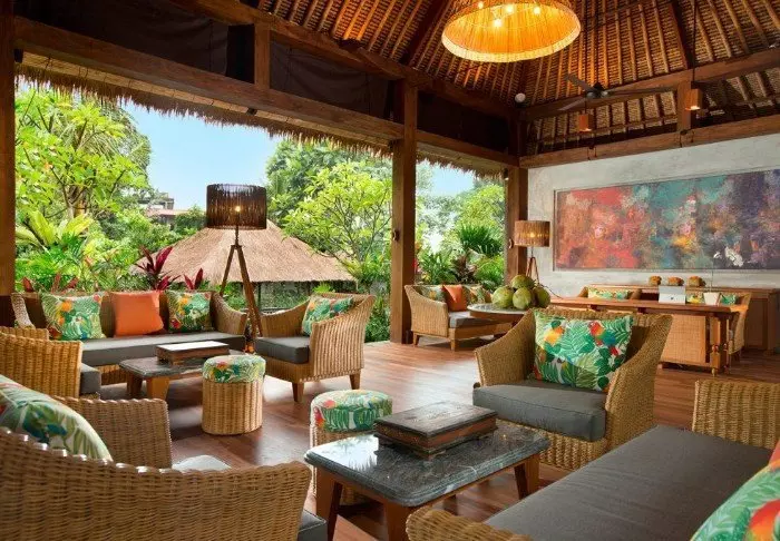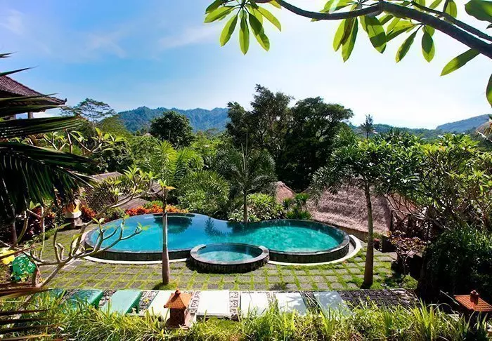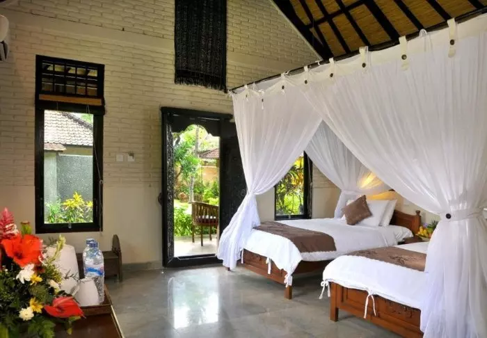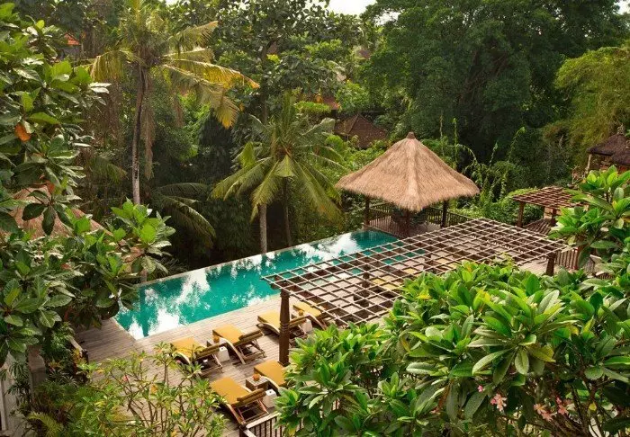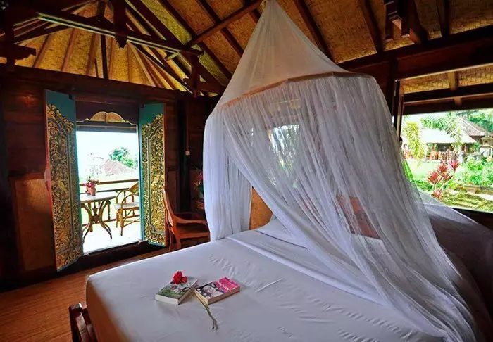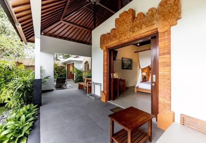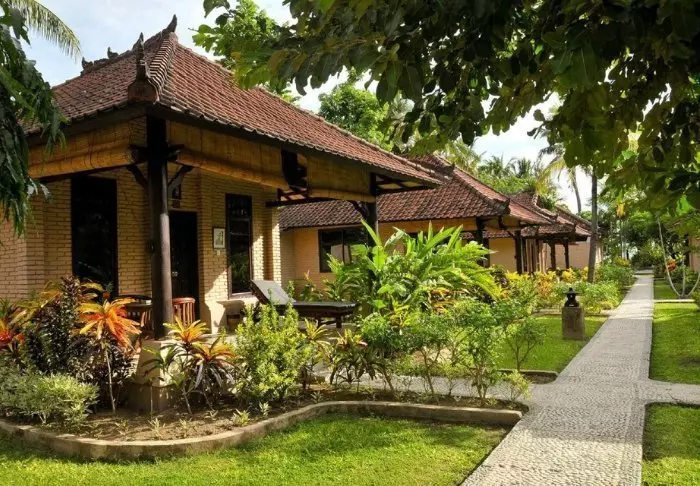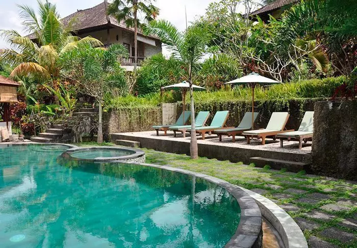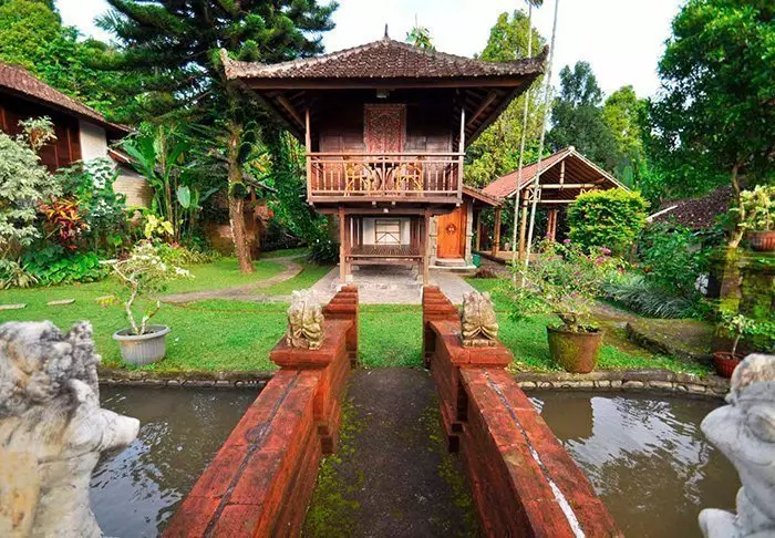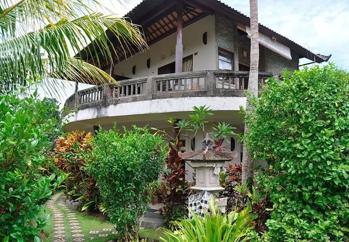 Det lille hotellet er bygget i tradisjonell balinesisk stil med naturlige materialer som ligger vakkert til i de grønne omgivelsene.