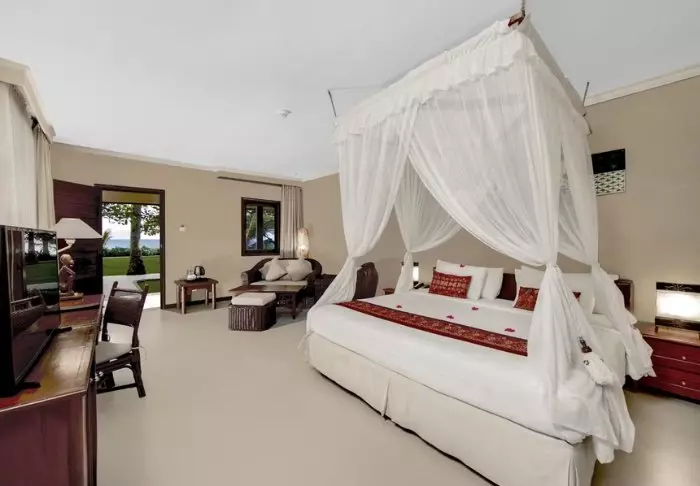 Resorten er omgitt av en stor tropisk hage og bygget i tradisjonell sasak-stil. Alle 35 rom er innredet med vakre naturlige materialer fra gulv til tak og dekorert med flotte, vevde tekstiler. Her er det både aircondition, Wi-Fi, minibar, gratis vann på flaske, safe, TV og DVD-spiller. Badet har regndusj, hårtørker og gratis toalettartikler. Fra balkongen din kan du nyte den lette brisen og utsikten over hagen med mango- og palmetrær eller buktens rolige vann.