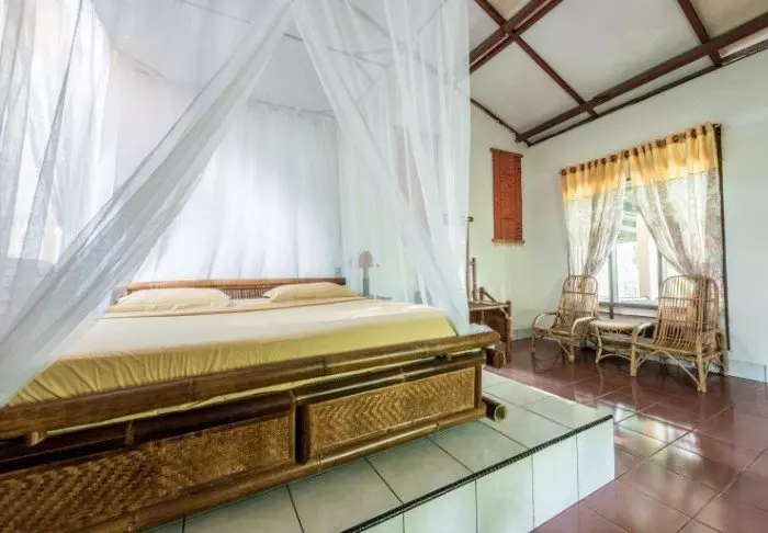 Resorten er liten og personlig, med bare 11 rom som ligger fordelt i bungalower i en frodig hage med høye kokospalmer og tropiske trær. Alle rom har Wi-Fi, aircondition, tak vifte, minibar, safe, kaffe-/tefasiliteter, toalettbord og skjenk. Sengen er strategisk plassert ved det store vindus partiet, slik at du kan nyte soloppgangens flotte farger på himmelen allerede når du slår øynene opp. Rommene har delvis utendørs bad med regndusj og hårtørker. På terrassen er det både liggestoler og et hyggelig sitteområde.