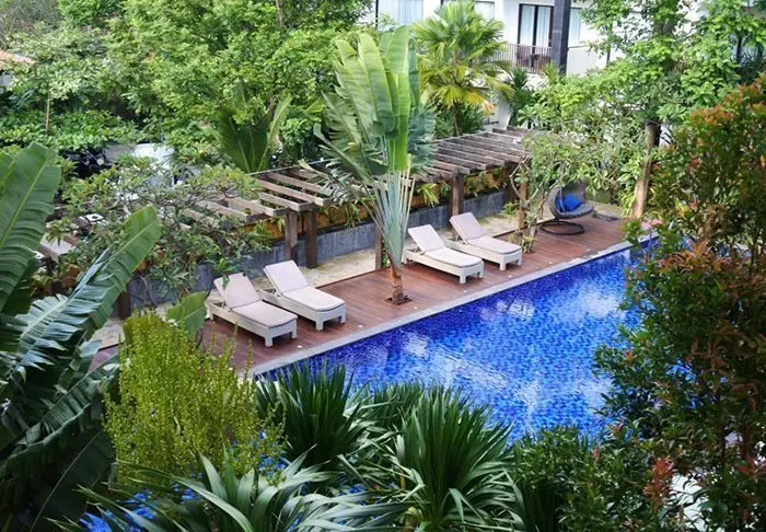 I hagen finner du hotellets svømmebasseng, og det ligger som en liten oase blant hagens store trær og høye palmer. Ta en dukkert og slapp av ved bassengkanten litt – stillheten og utsikten er helt magisk.