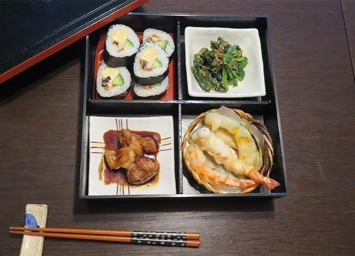 Bento-boksen er det japanske svaret på matpakke. Det er en liten beholder med ris, fisk eller kjøtt, litt grønnsaker, sushi osv. Disse lekre boksene kan kjøpes overalt, og er en perfekt lunsj. I dag får du muligheten til å lage din egen bento-boks. Du starter på japansk vis med en kopp grønn te og en kort innføring av kokkene, som snakker godt engelsk.