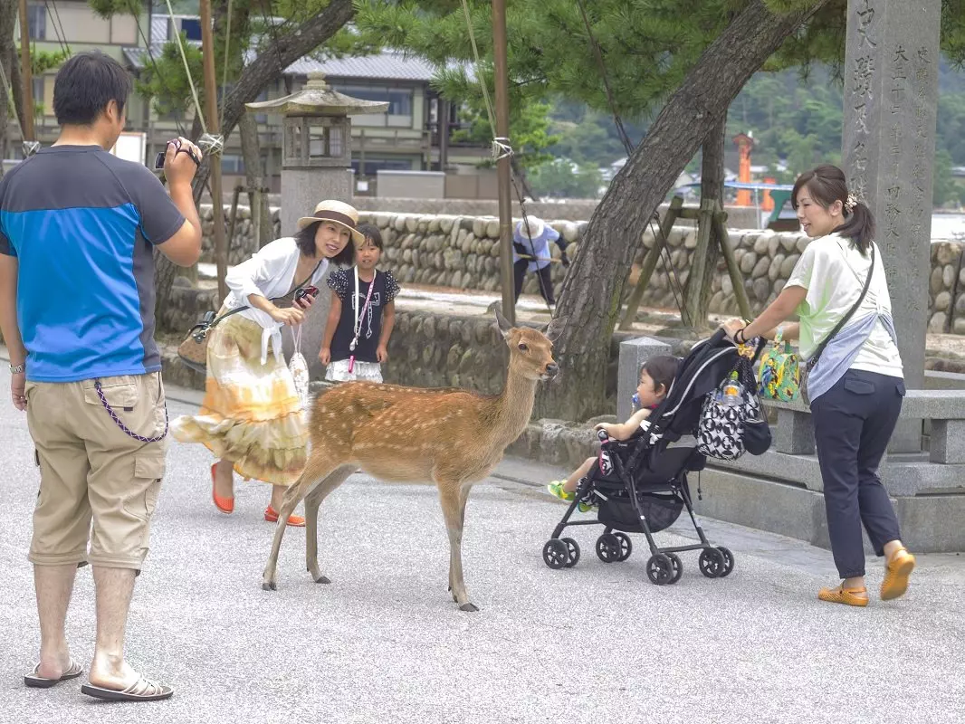 Vi foreslår en dagstur til Miyajima. Miyajima ligger mindre enn én times reise fra Hiroshima, og det er enkelt å komme dit med offentlig transport. Det er her du finner den knapt 20 meter høye verdensberømte oransjerøde porten som ligger ute i vannet, og som ved høyvann ser ut som om den flyter på vannet. Når du ankommer øya, som egentlig heter Itsukushima, med fergen kommer du gjennom noen turistgater med suvenirbutikker, små gavedelikatesseforretninger og kafeer før du kommer frem til stedet der du kan se den enorme porten. Underveis treffer du nok også de tamme sikahjortene. På øya ligger Daisho-in, et buddhistisk tempel som er åpent for besøkende. Et merkelig fenomen er at buddhaene her ofte har på seg skjerf og lue. Du kan også ta kabelbanen til toppen av Misen-fjellet, der du har en formidabel utsikt over Hiroshima og innlandshavet, der det ligger over 3000 småøyer.
