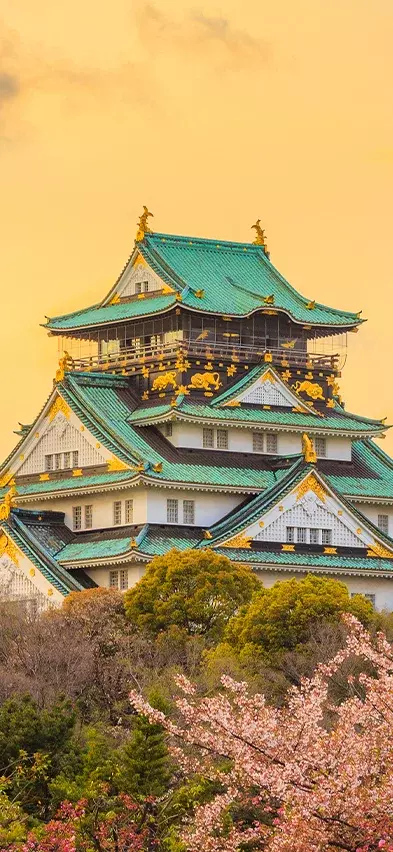 Ved ankomst i Osaka blir du hentet av en guide som følger deg til hotellet ditt. Deretter venter en interessant halvdagstur der guiden tar deg med på offentlig transport til Osaka-borgen. Den stammer fra shogun-tiden. Borgen er meget imponerende og utvendig en av Japans aller vakreste borger. Under besøket og i den tilhørende parken får du høre om shogun Hideyoshis storhetstid, da han brukte 100 000 mann til å bygge borgen sin på 3 år. Borgen har vært brent ned og gjenoppbygd flere ganger – senest i 1931. Fra øverste etasje er det flott utsikt over Osaka.