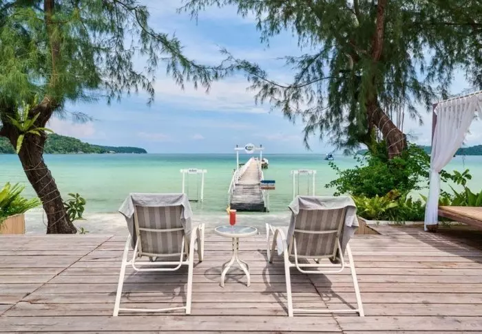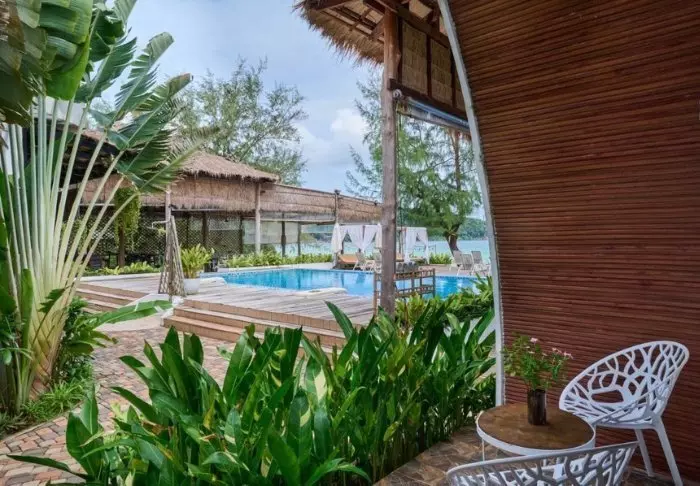 Veranda Natural Resort ligger i en frodig skråning nedenfor Kep nasjonalpark, med utsikt over Thailandbukten, øya Tonsay og Phnom Bokor nasjonalpark i horisonten. Resorten ligger i et naturskjønt område på 2,5 hektar, så her er det mye plass til å drive med aktiviteter eller finne fred og ro. Resorten har fokus på vakre omgivelser, ro og god mat. Fra resortens hovedbygning er det gangbroer av tre gjennom det grønne området til rommene. De store rommene på 30 m² er individuelt innredet i minimalistisk stil med luksuriøse materialer, aircondition, gratis Wi-Fi, kaffe-/tefasiliteter, minibar, TV, verdiboks, badekåper, hårtørker, eget bad og veranda.