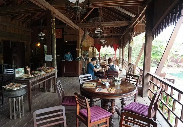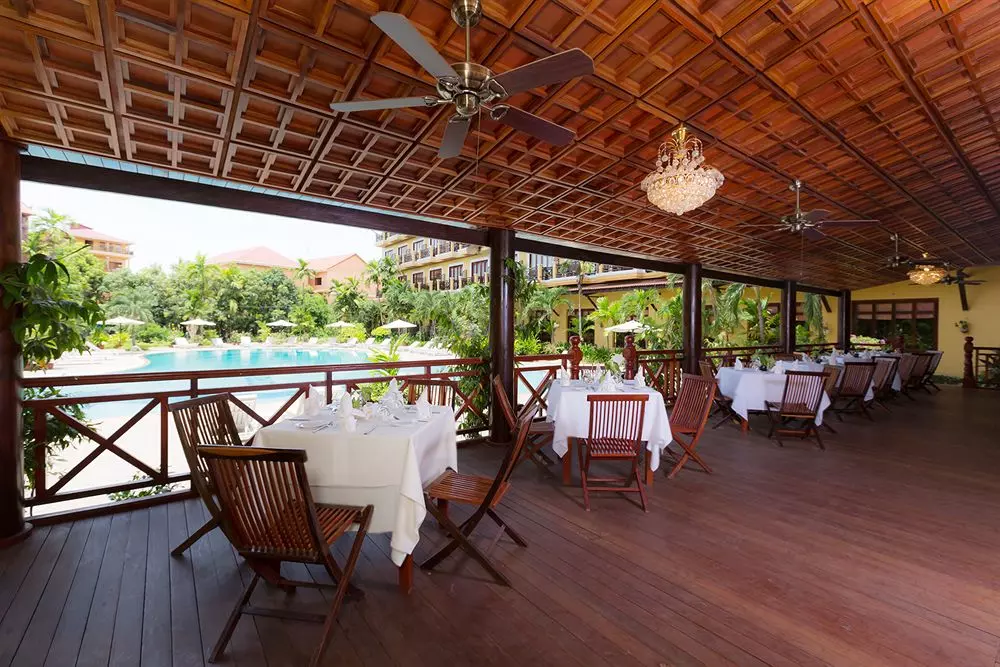 Den koselige restauranten ligger på en overdekket terrasse med utsikt mot hagen og svømmebassenget. Her trylles det frem lekre retter fra det kambodsjanske og internasjonale kjøkken både til frokost, middag og kvelds. Det finnes også et velassortert vinkart.