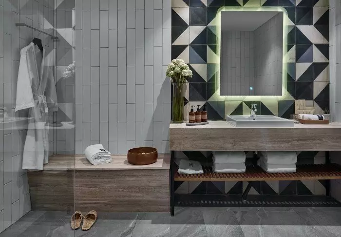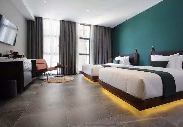 Den rustikke og moderne designen går igjen på rommene, som er veldig trivelig og hyggelig innredet med varme farger. Alle de105 rommene har aircondition, Wi-Fi, minibar, safe og elektrisk kjele, slik at du kan lage deg en kopp te eller kaffe. På badet finner du badekåpe, tøfler, toalettartikler og hårtørker.