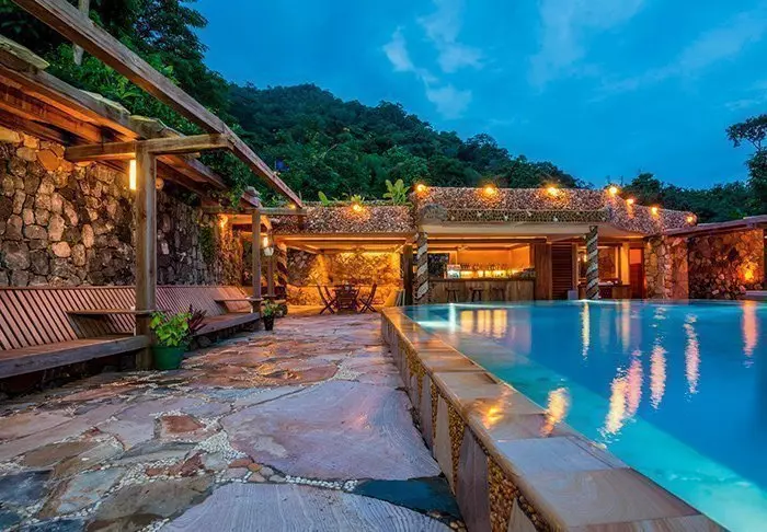Hagen er en liten oase med massevis av grønne, tropiske planter og til og med palmer og dammer. Her er det fredelig, og roen avbrytes bare av den boblende jacuzzien. Vannet herfra faller som en liten foss i bassenget nedenfor.