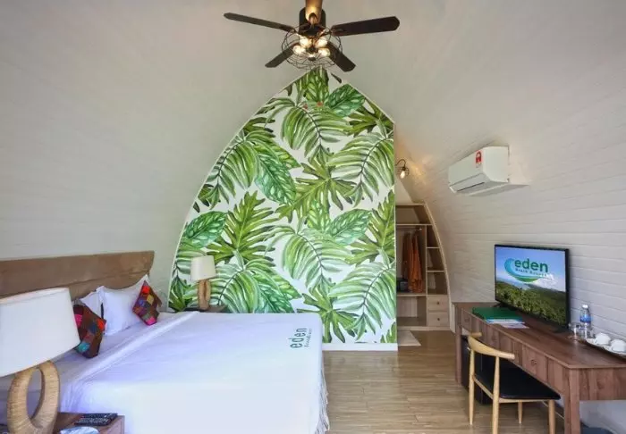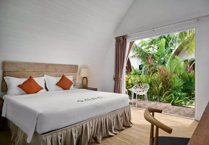 Resorten har 33 bungalower som er lyse og smakfullt dekorert med bærekraftige materialer. Alle har aircondition, minibar, TV, takvifte, kjøleskap, fasiliteter for å lage kaffe/te, TV og wifi. En skyvedør åpner seg mot en privat balkong med bord og stoler, der du kan nyte roen og de frodige omgivelsene. Badene er utstyrt med dusj, hårføner og toalettsaker.