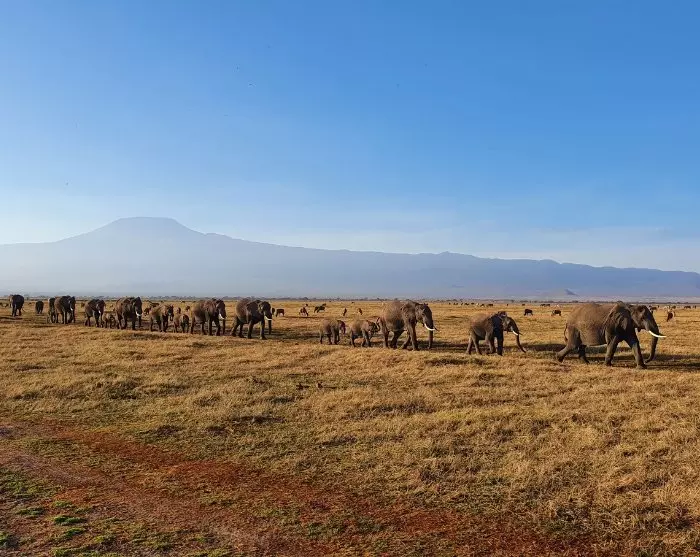 Nesten uansett hvor du går, vil du ha utsikt over Kilimanjaro, som ligger i Tanzania, men som trolig blir oftere fotografert fra Kenya-siden. I Amboseli kan du faktisk være heldig nok til å få det perfekte bildet av elefantene som vandrer over det pannekake-flate landskapet mens solen går ned, før de går inn i skogene ved foten av Kilimanjaro, der de tilbringer natten.