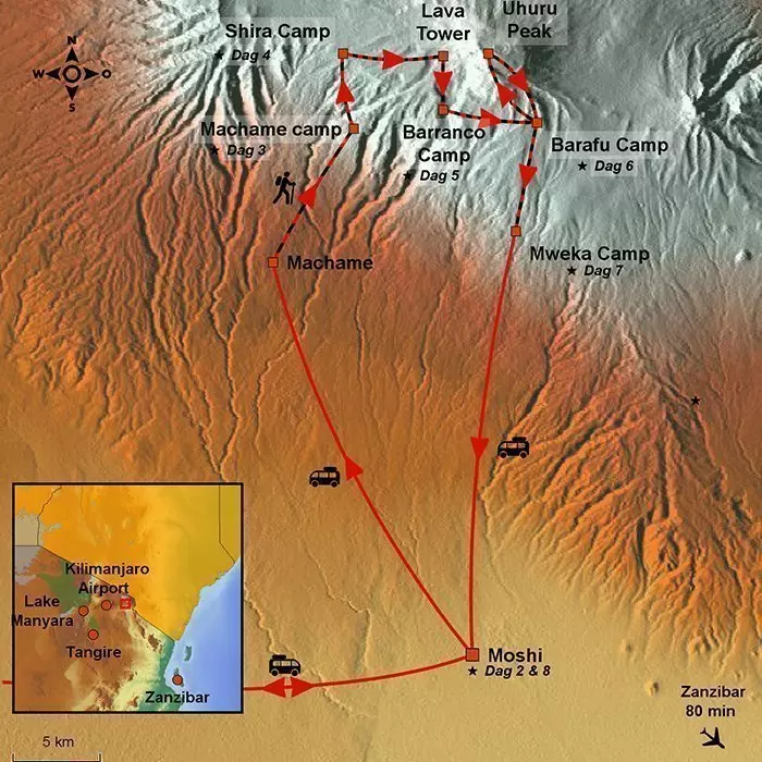 Etter frokost forlater du Moshi og kjører til landsbyen Machame – en kjøretur på 50 min. Her møter du teamet av guider, kokker og bærere som forbereder og pakker utstyret ditt. Deretter går turen til Machame Gate, den sørvestlige inngangen til Kilimanjaro nasjonalpark. Her er der innsjekking og registrering før du begynner din vandring gjennom regnskogen til toppen av Kilimanjaro. Kilimanjaro består av tre utslukte vulkaner: Kibo med det høyeste punktet Uhuru (5.895 moh.), Mawenzi (5.149 moh.) og Shira (3.962 moh.).