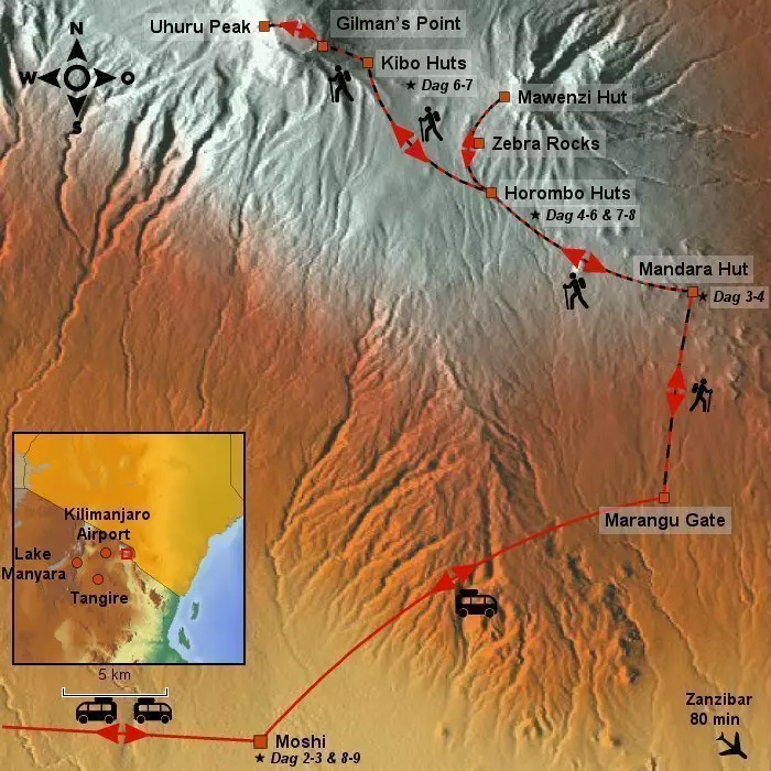 Høyder: Moshi: 915 moh., Marangu Gate: 1 860 moh., Mandara Huts: 2 740 moh.