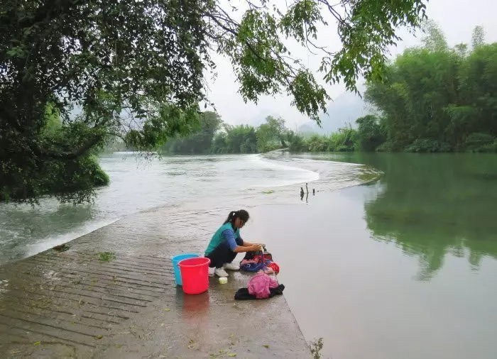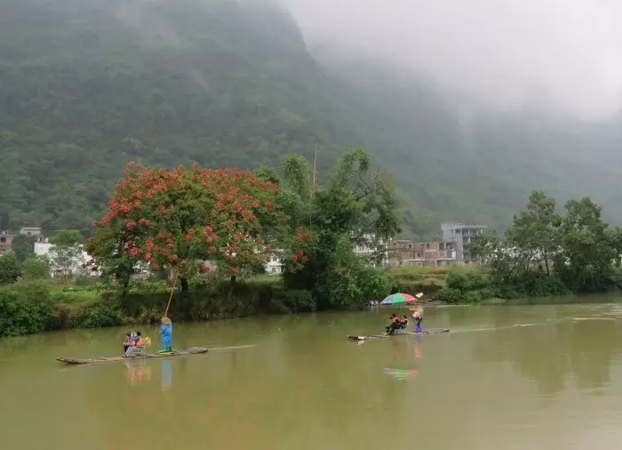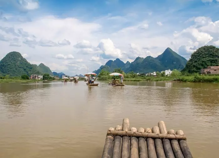 Så begynner eventyret gjennom Yangshuos idylliske og maleriske natur. Den neste timen flyter du forbi høye, asymmetriske kalksteinsfjell, skog, rismarker og små landsbyer. Du kan bl.a. oppleve kvinner som vasker tøy i elven, menn som fisker, og bøfler som arbeider ute på markene.