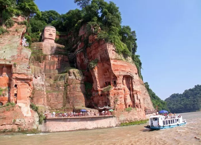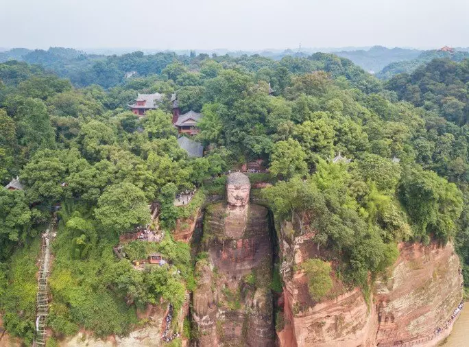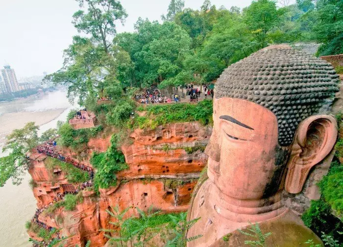 Du kommer til en utsiktplattform der du nærmest står ansikt til ansikt med buddhafiguren, som har en høyde på 71 meter og en bredde på 28 meter. Her kan du beundre de 1 021 fint uthugde hårkrøllene. En smal steintrapp på 217 trinn fører nedover langs buddhaens side og hele veien ned til føttene. Underveis kan du beundre den imponerende statuen fra forskjellige vinkler. Størrelsen vil nok overraske de fleste – bl.a. måler hodet hele 14,7 meter, fingrene, med negler, er 8,3 meter lange, mer enn fire ganger så lange som et menneske, og føttene har en lengde på 11 meter. Statuen er virkelig imponerende og overveldende!