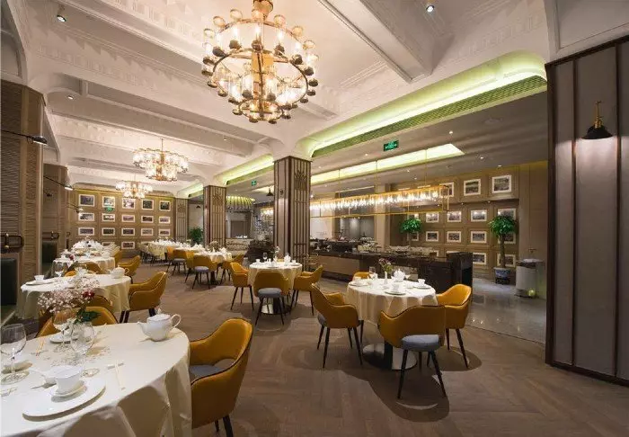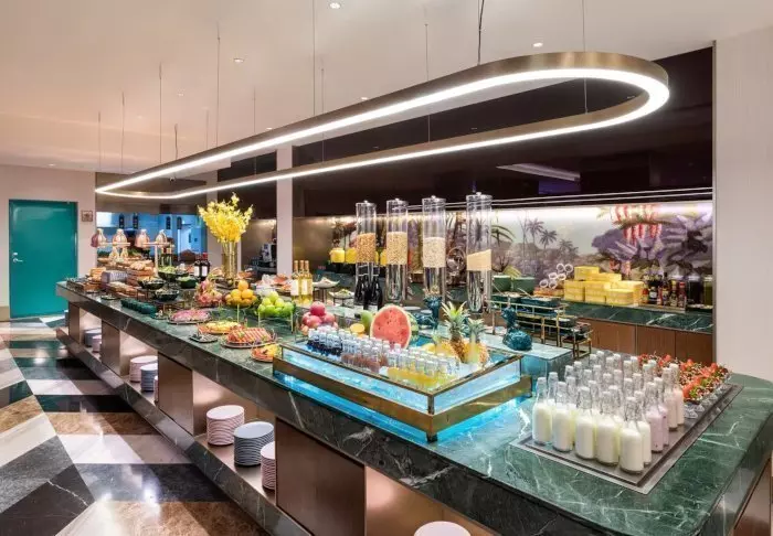 På hotellets frokostrestaurant venter det hver morgen en stor og innholdsrik frokostbuffet med både vestlig- og kinesiskinspirerte retter.